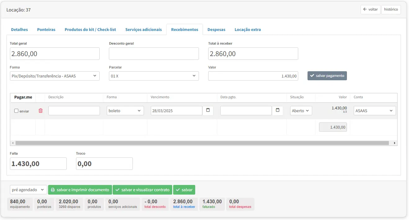 – Edite a locação e clique na aba recebimentos