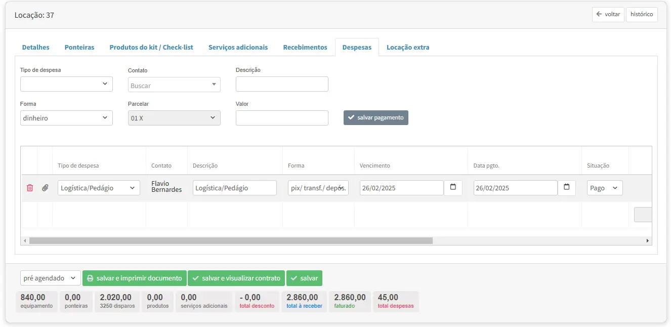 Aba Despesas da locação #